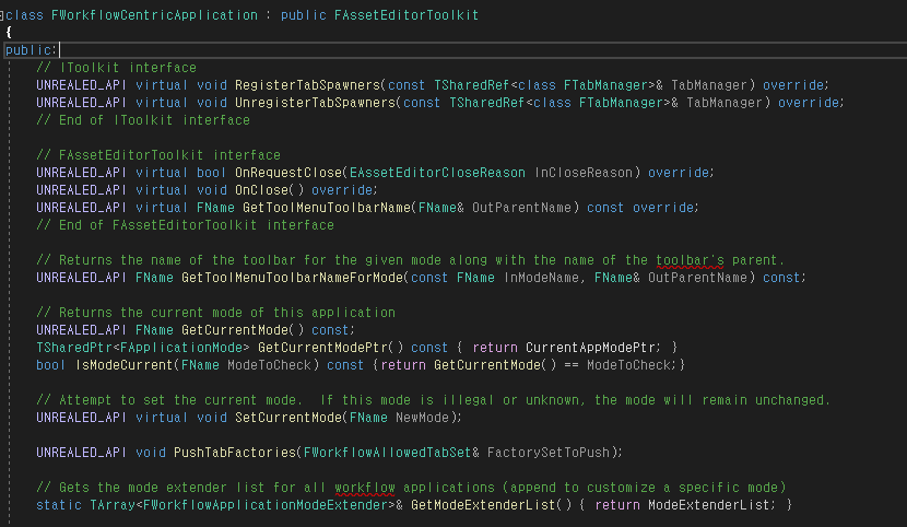 그 중에서 에디터를 커스터마이징 하기위해서는 FAssetEditorToolkit 혹은 FWorkflowCentricApplication을 상속받아 진행됩니다.